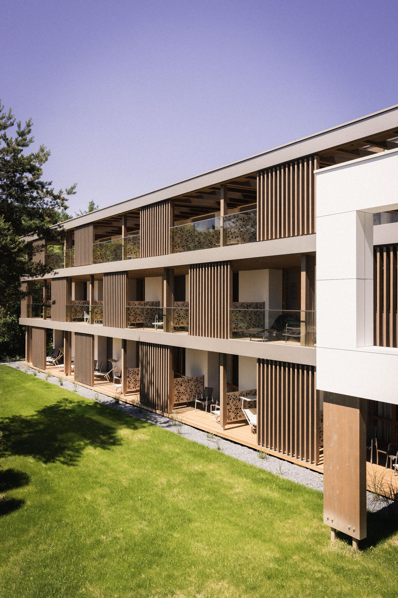 Alle Balkone und Terrassen sind mit Holzböden verlegt. Ein Glasflächen-Geländer weitet den Blick in die Landschaft und Trennwände zu den Nebenzimmern garantieren viel Privatsphäre. Sitzmöglichkeiten und Sonnenliege bieten einen entspannten Blick ins Grüne.