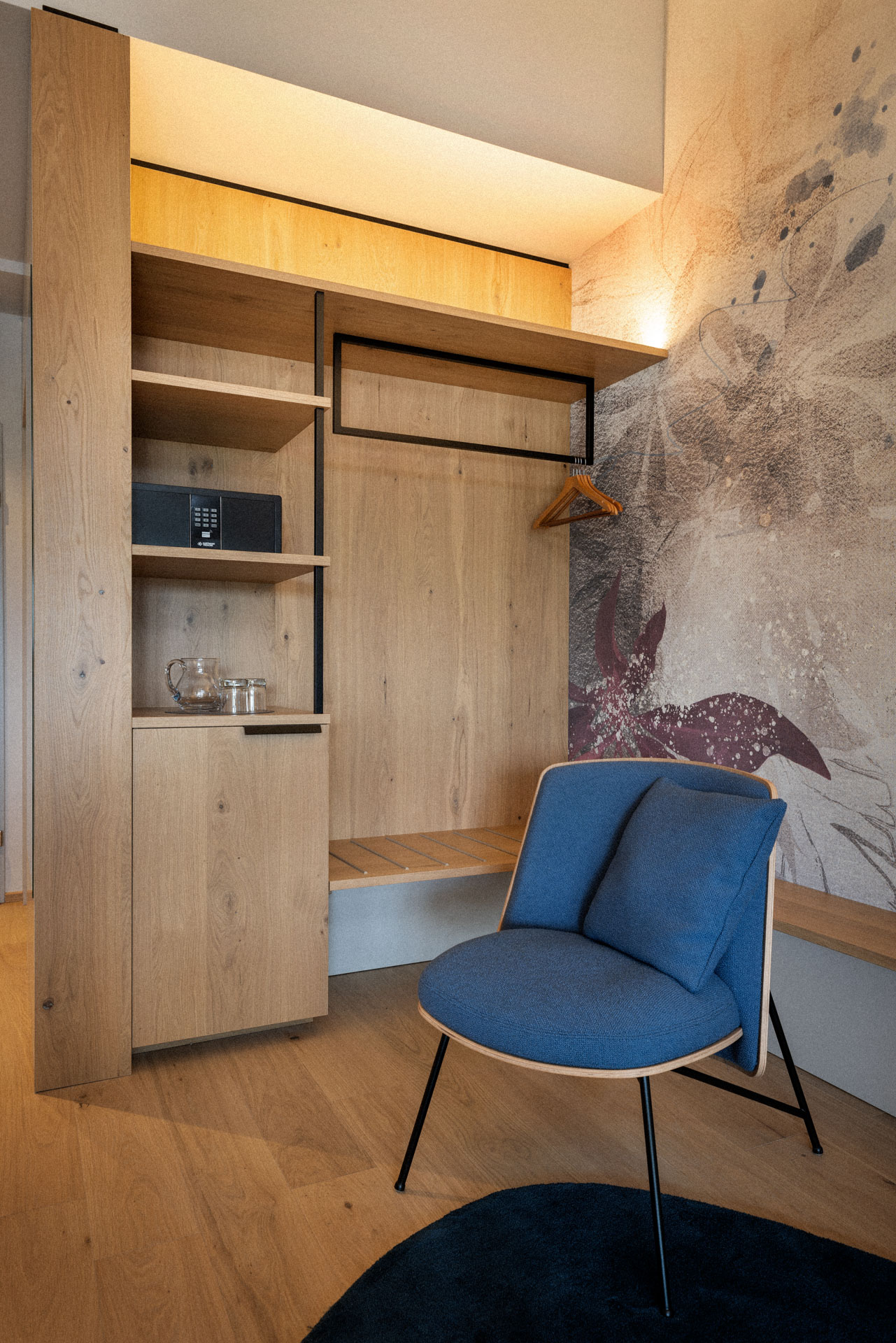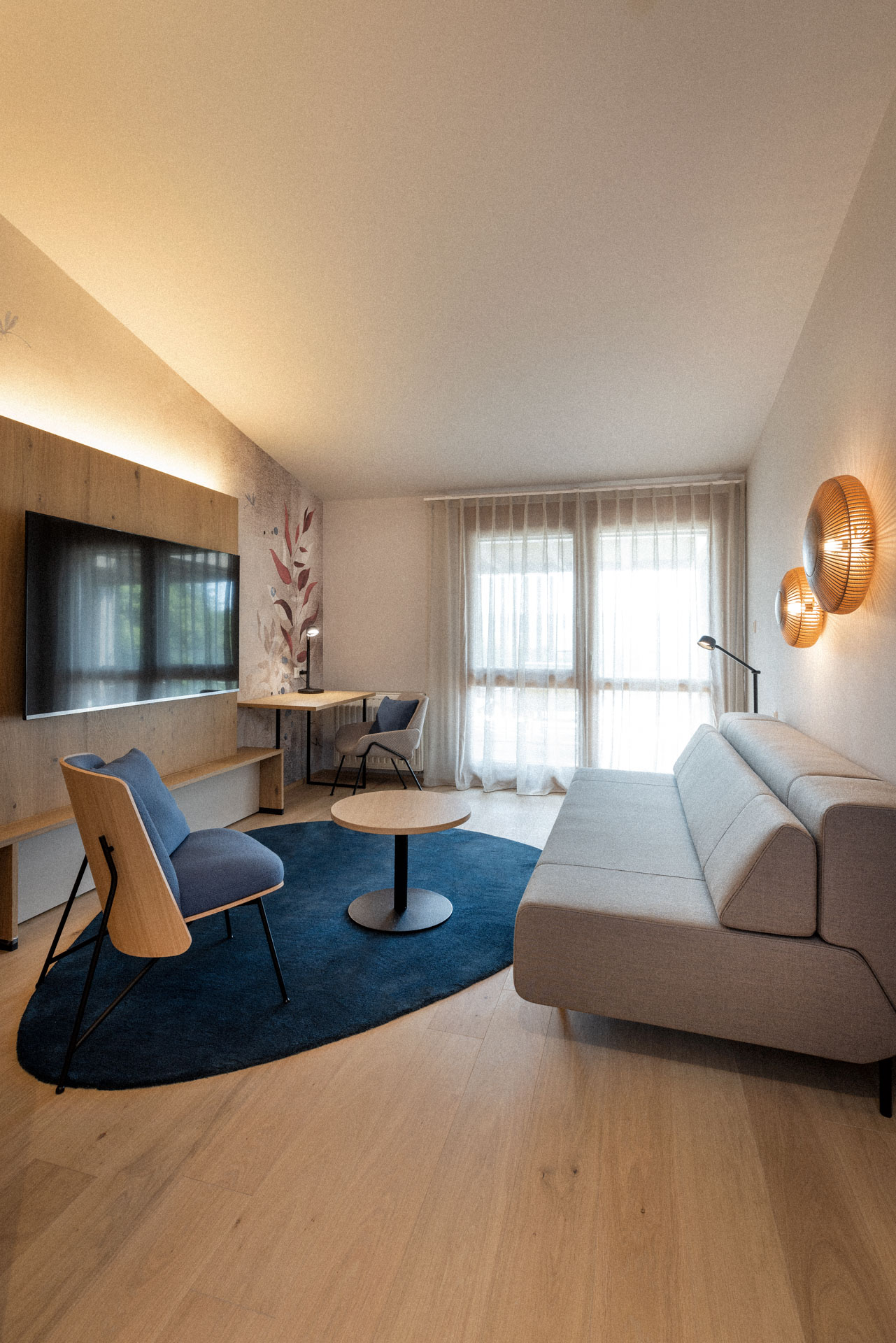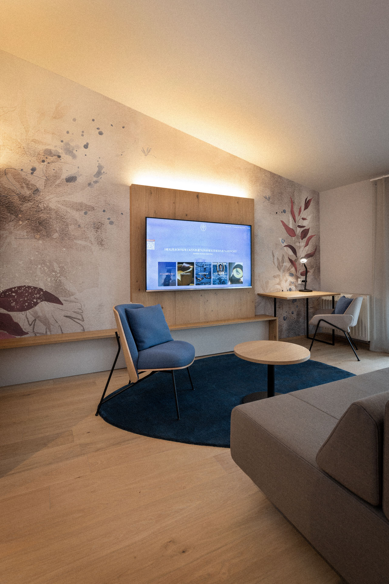 Die in Naturtönen und zarten Farbakzenten gehaltenen Zimmer und Suiten bestechen durch natürliche Materialien wie Holz, stilvollen Möbeln, einem innovativen Infotainment-System und zahlreichen weiteren praktischen Details. Behaglichkeit und Wärme, die alle Sinne berühren, versprüht die besondere Farb- und Materialharmonie.