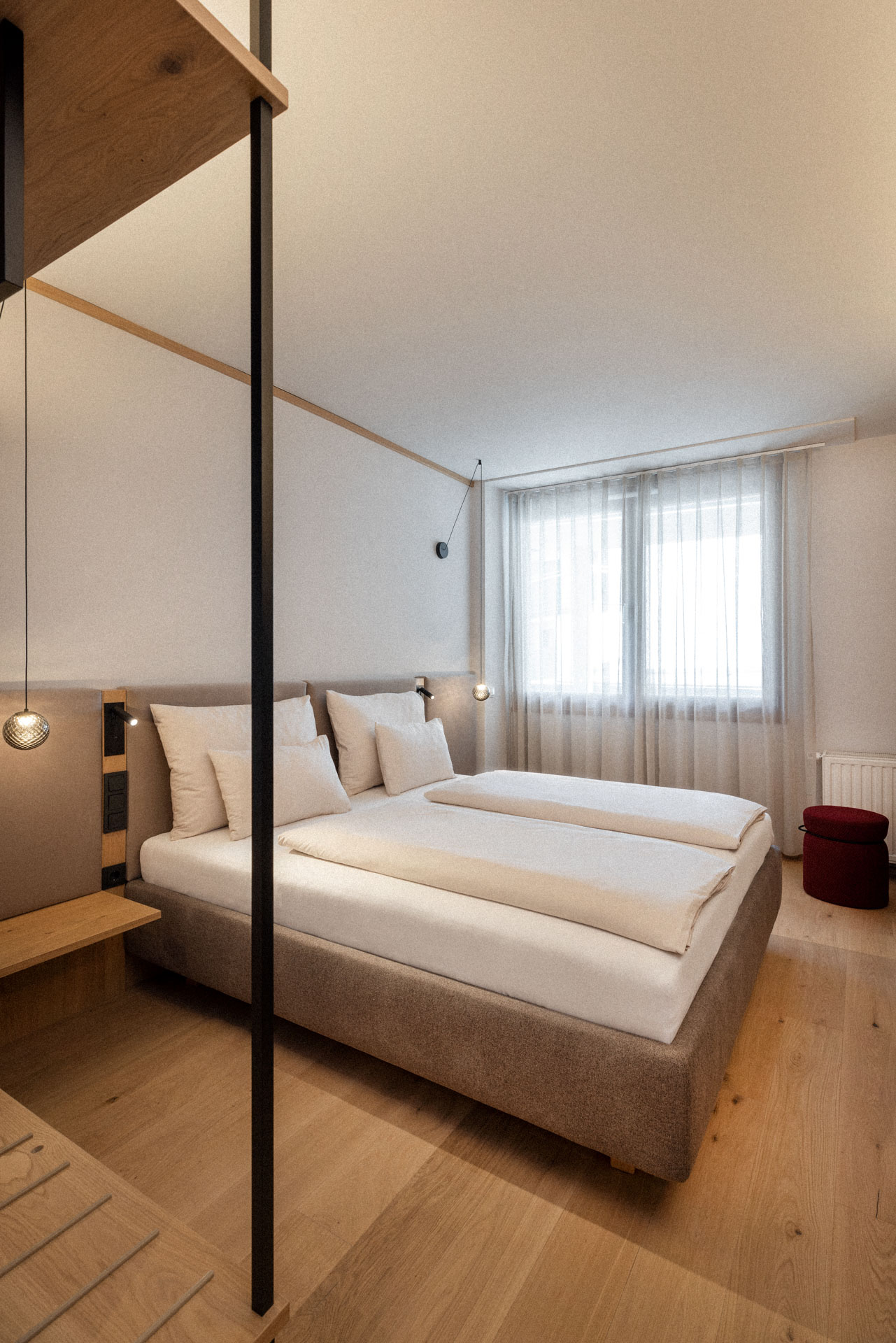 25 m² großes Zimmer mit Doppelbett, Badzimmer mit ebenerdiger Dusche und getrennter Toilette