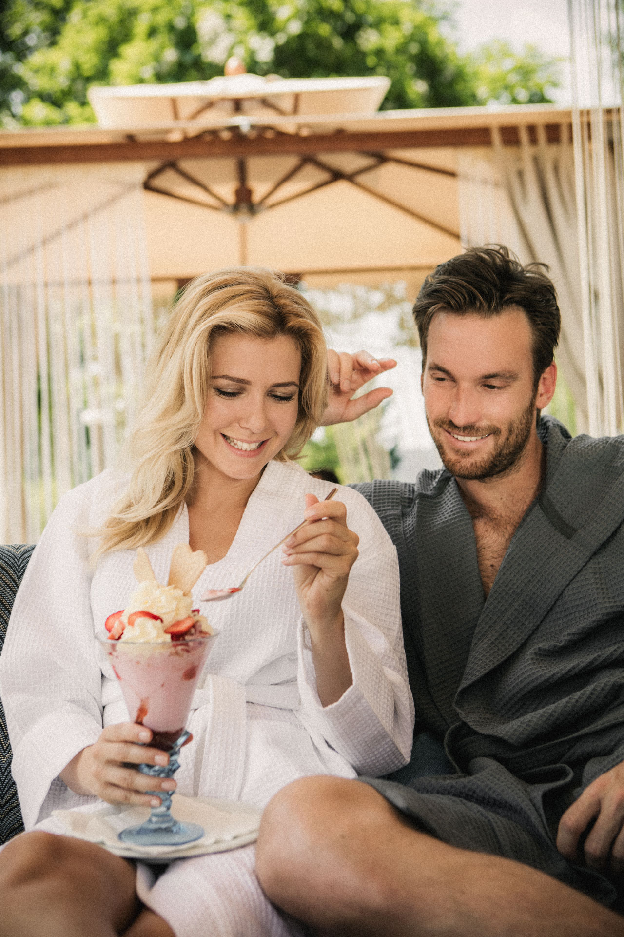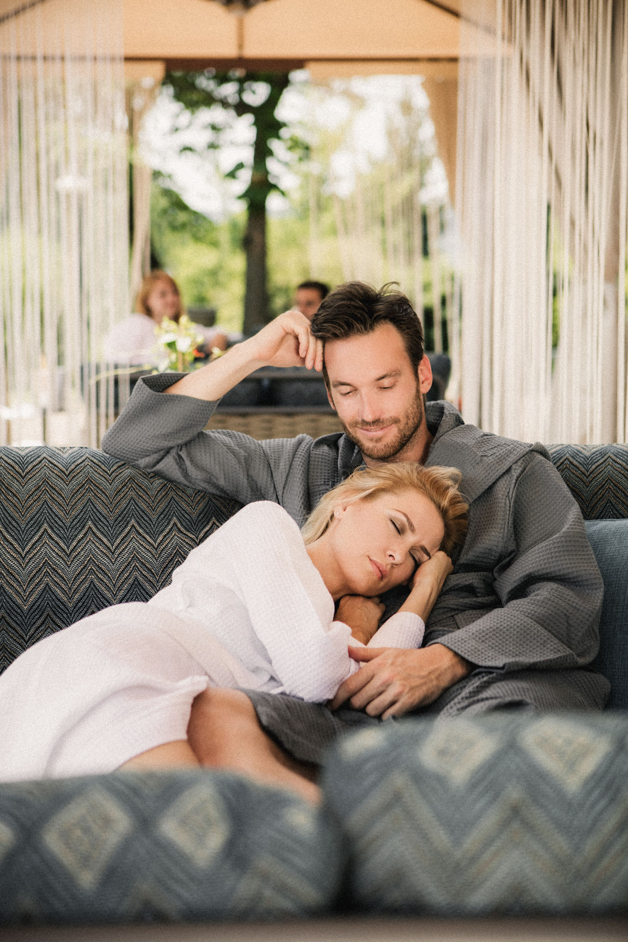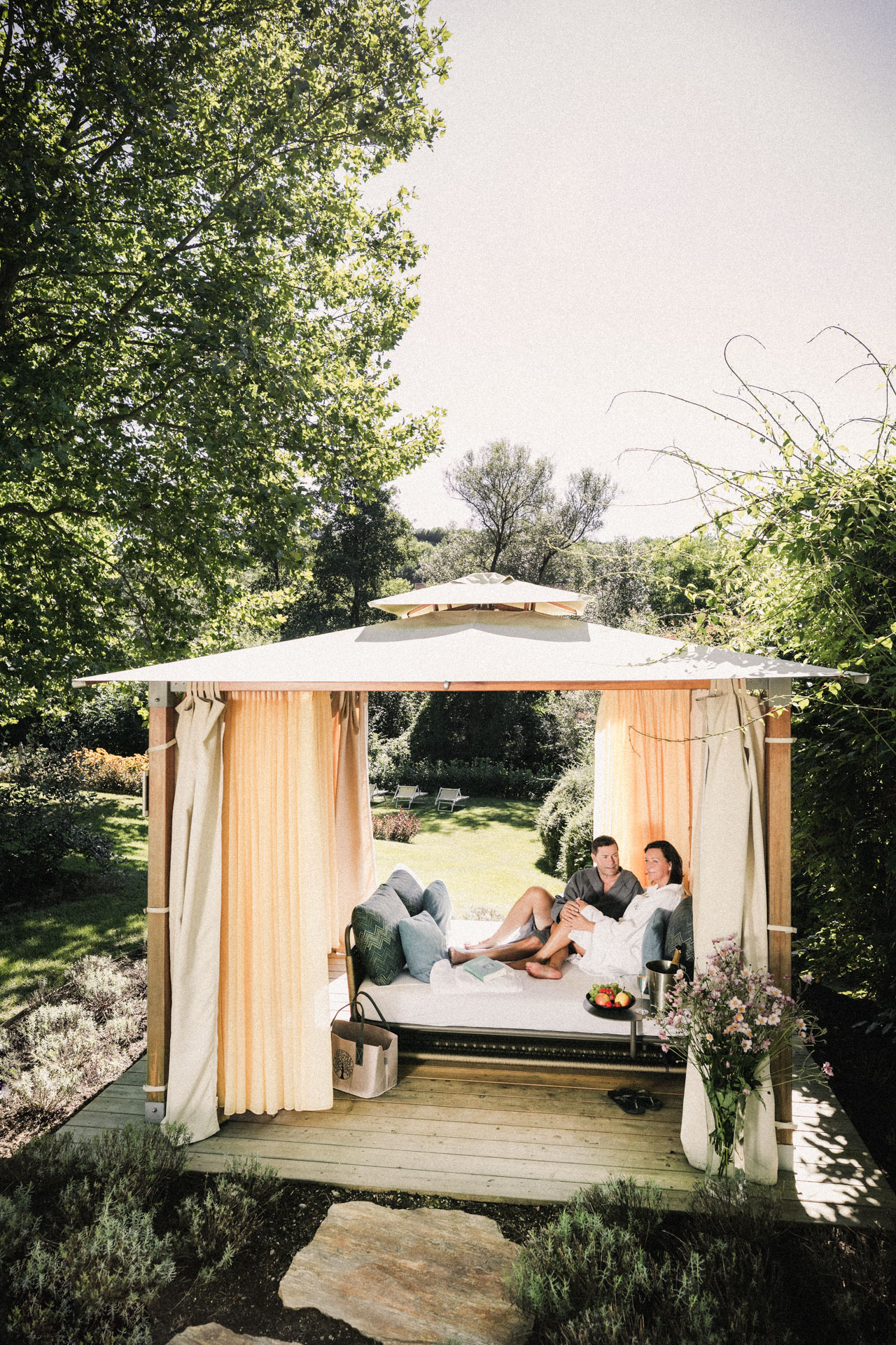 Entspannen Sie in unseren Luxus-Pavillons mitten im Grünen oder auf unseren Luxus-Doppelliegen in der Ruheoase Wintergarten. Badetasche mit flauschigen Bademänteln und Handtüchern inkl. 3-Gänge Mittagsmenü im Restaurant Quellblick und einer Genussmassage pro Person.