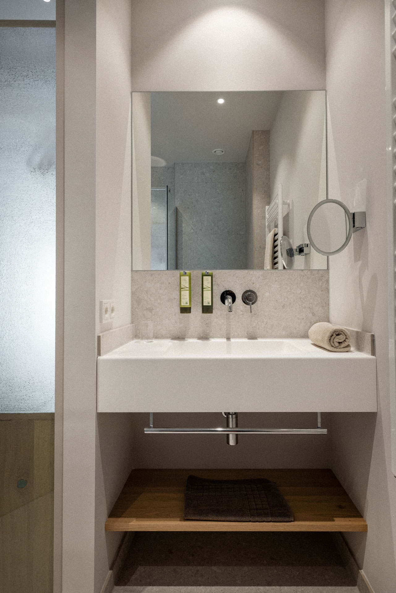 Komfort in unserem neu gestalteten Superior Einzelzimmer mit natürlichen Materialien, stilvollen Möbeln und besonderem Schlafkonzept. Badezimmer mit ebenerdiger Dusche und natürlichem Licht.